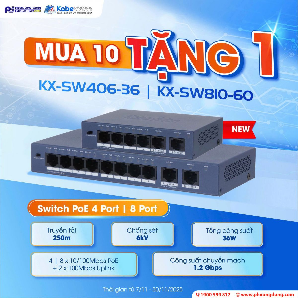 Từ ngày 07/11 đến 30/11/2025, khách hàng khi mua 10 bộ Switch PoE Kbvision (model KX-SW406-36 hoặc KX-SW810-60) sẽ được tặng ngay 1 bộ cùng loại.