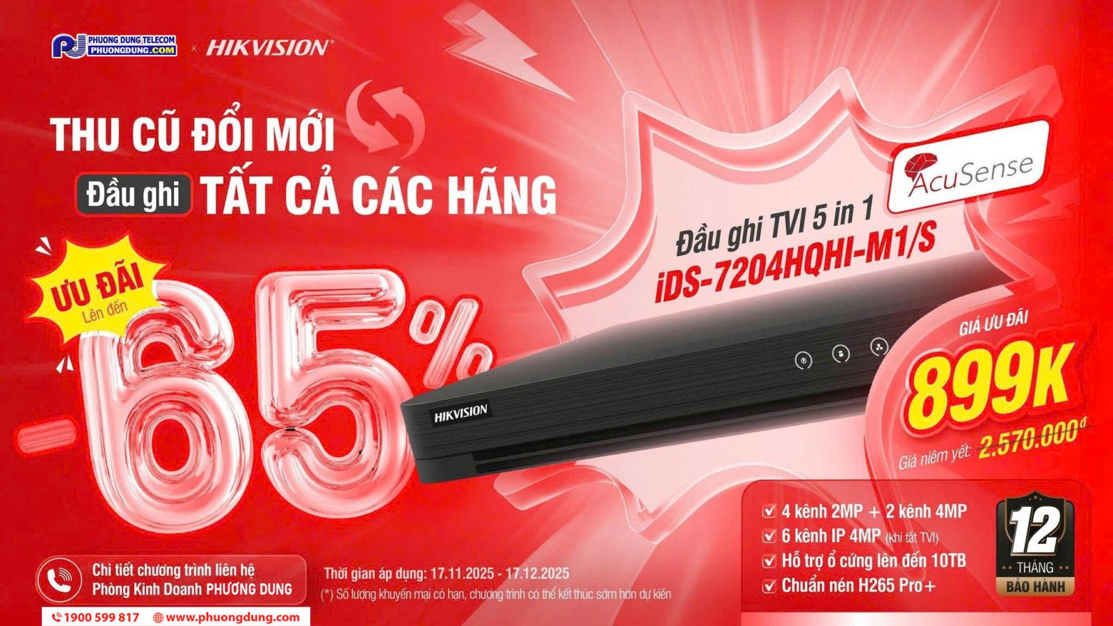 Trong thời gian diễn ra chương trình, khách hàng có thể đổi đầu ghi cũ để nhận ưu đãi, với mức giá chỉ còn 899.000 đồng, giảm sâu so với giá niêm yết 2.570.000 đồng. Đây là cơ hội giúp người dùng sở hữu thiết bị mới chính hãng Hikvision với chi phí cực kỳ hợp lý.