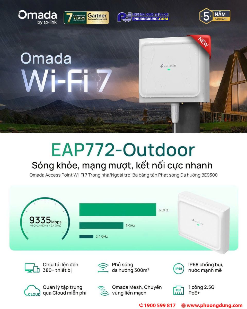 Cập nhật: 16/03/2026 15:56:30:PM , Lượt xem: 120 lượtOmada EAP772-Outdoor là thiết bị Access Point Wi-Fi 7 thế hệ mới, được thiết kế chuyên dụng cho môi trường ngoài trời với khả năng kết nối cực nhanh, ổn định và độ bền vượt trội. Sản phẩm mang đến giải pháp phủ sóng mạnh mẽ cho khu nghỉ dưỡng, quán cà phê sân vườn, nông trại, kho bãi, khuôn viên rộng hoặc các khu vực công cộng đòi hỏi hệ thống mạng tốc độ cao và ổn định suốt ngày đêm.