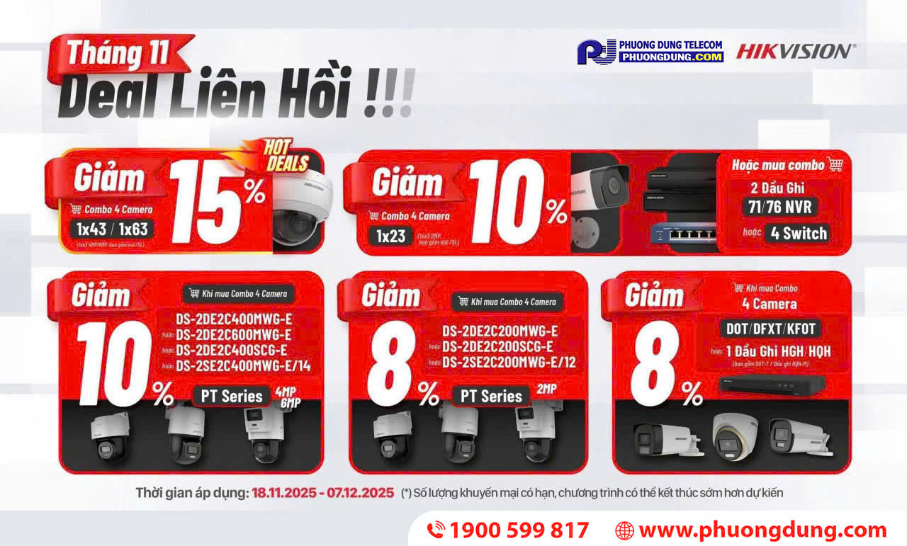 Tháng 11 đánh dấu giai đoạn nhu cầu lắp đặt – nâng cấp hệ thống an ninh tăng mạnh trên toàn thị trường. Thấu hiểu điều đó, Phương Dung Telecom, nhà phân phối thiết bị an ninh & giám sát hàng đầu, chính thức triển khai chương trình ưu đãi đặc biệt giảm giá sâu lên đến 15% cho nhiều dòng sản phẩm Hikvision.